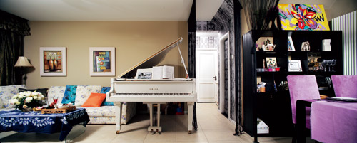 黑色花纹壁纸及圆形立柱散发出独特气味,纯白色家具、紫色窗帘在深色中增添居室亮度。