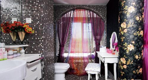 暗色的马赛克与纯白的洗浴设施,制造出鲜明的个人特色。黑色花纹的柱子中其实隐藏了洗浴间的管道。