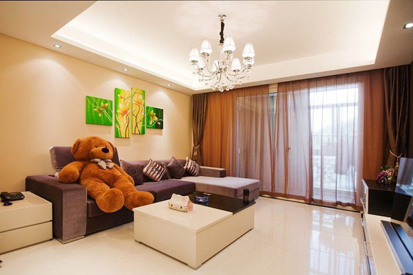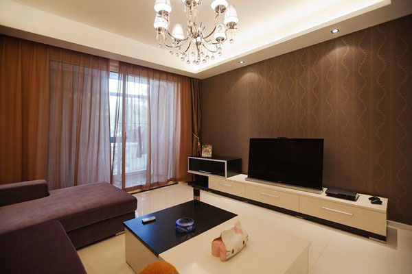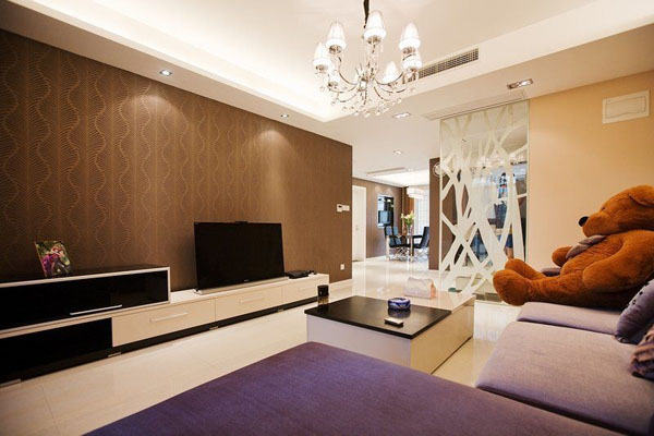 客厅的墙面,窗帘及布艺沙发以咖啡色及紫色系列。让充满现代感的简约空间里多了一些浪漫温馨。