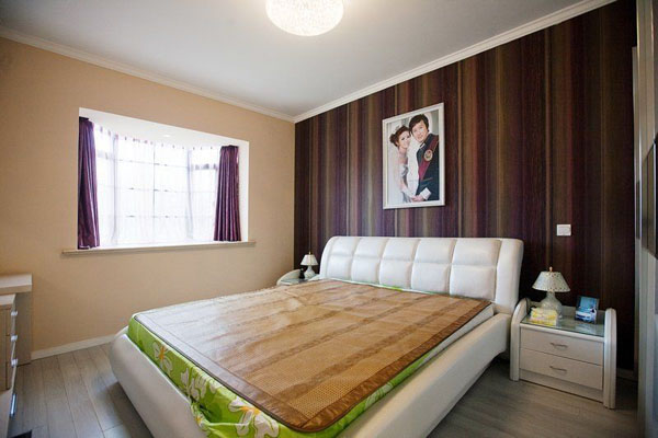 卧室里软装还没有进场,我们就先来拍一些图。卧室的背景墙用坚条纹的墙纸,衣服是宜家买的,床头柜也一样,这个比木工做要美观许多。