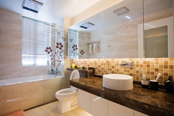 卫生间里装修以现代风主,咖啡的大理石台面衬托着洁白的台盆,浴缸与马桶以一扇强化玻璃做形式的隔开。