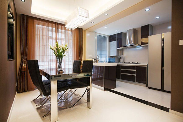 餐厅与厨房相对,厨房间采用的半开放式的。房东说他们都不是很喜欢油烟,家里做饭也少,这样就足够了、