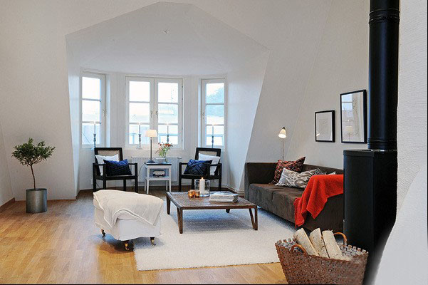 客厅里的设计有着淡淡北欧的感觉,宽敞明亮的空间,斜角的客厅线条,形成一个简单又性格的客厅环境。