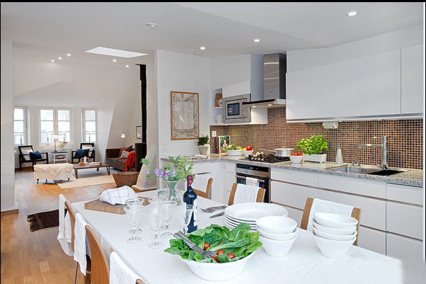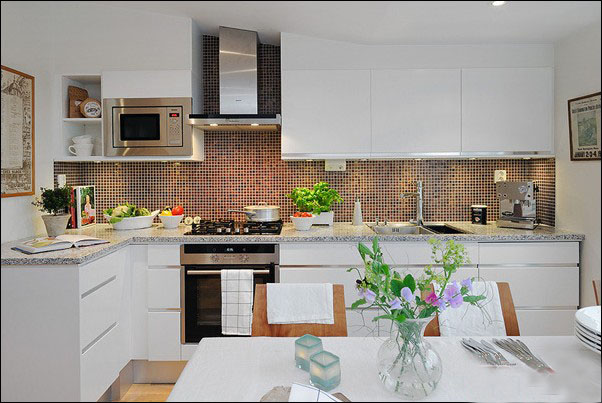 开放式的厨房很能挑战主妇的清洁力度,这里白色的橱柜同马赛克的花色形成了鲜明的对比。