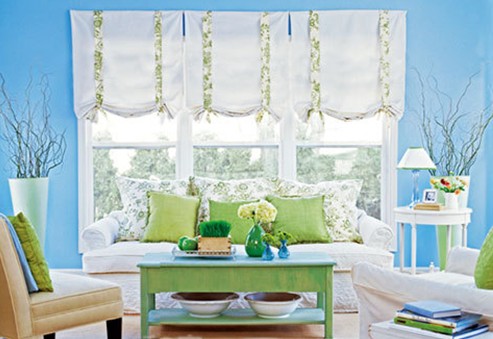 粉绿色充填在以蓝色为主调的空间内,使得客厅空间风格转变为乡村式风格。沙发上嫩绿色的靠枕和白绿色相间的花纹大靠枕,形成了统一的色调,花草的图案,木质的家具都体现出田园的风格。室内鲜亮色彩的搭配保持着房间的轻盈通透感。嫩绿色沁人心脾,很适合夏季居室色调,更贴近大自然的感觉。