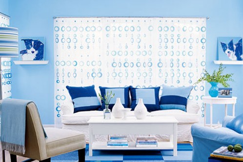 不管是常有的白色,还是少用的蓝色,都很适合夏季使用。多增加点蓝色,再加以大胆的几何图案,这间客厅便会呈现出清爽的氛围。直条纹图案的靠枕,深浅有序的蓝色地毯,以及波点的窗帘装饰,深深浅浅的色彩自由的组合在一起,保持着色彩的平衡。置身于这样的居室空间内,让成人的内心世界多了份俏皮的心理。