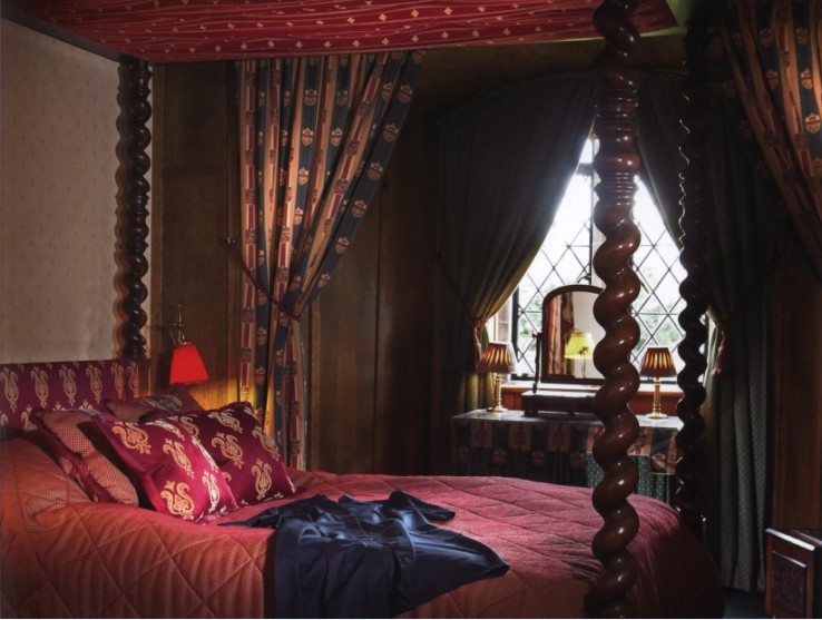 这是一个古典的卧室,通过帷幔的设计将床与整体空间形成既互相融合又彼此独立的空间关系,拉开帷幔,床成为空间的一处陈设和装饰元素;闭合帷幔,床又成为一个独立的与外界隔离的私密空间。