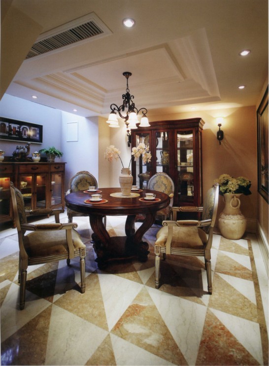 新贵族式风格是尊贵、端庄的,因此对于材质的选择很是考究。大厅和公共区域的地面,以及卫生间的墙面、地面,通常采用花岗石材拼花铺贴。而卧室则采用满铺的羊毛地毯,或者实木地板结合手工块毯铺地。