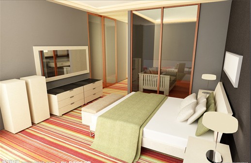 第二步:卧室中最主要的家具应该是床,但衣柜的地位也很重要。选择一组实榉木的衣柜,有三个大抽屉,里面可以放衣服和其它日用品,抽屉上面的开放空间可以方便的放置许多物品,电视置于其中,充分地利用了空间。磨砂玻璃柜门,其质感使室内显得明亮开阔。再有,用两个相同颜色的榉木床头柜作为床的搭配。床头柜有很深的抽屉,里面可以放一些必需品。柜子上面还可以放台灯穿衣镜、挂衣钩虽然是小东西,但其在居室中往往有不凡的效果。用与床同质感的穿衣镜及挂衣钩,在早上就能从容地穿上衬衣,忙而不乱地打理自己。