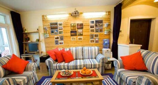 还好,房间还是存在着地中海的气息的。那也只能从沙发上体现了。原木的沙发背景贴上点照片。整个空间出来书是混搭之外,真说不出其他形容词。