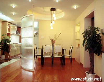 厨房是家庭“工作室”,较为明亮的散射灯光可使厨房显得更为宽敞、整洁。厨房通常采用吸顶或吊灯作一般照明,并在操作台的上方设置嵌入式或半嵌入式散光型吸顶灯。考虑到厨房油烟和水汽比较重,与其他房间的灯具相比,厨房灯可能经常需要拆洗,所以应尽量以简洁为主,灯具材料也以塑料和玻璃为佳,以方便清洁。若厨房兼做餐厅,光源宜采用暖色白炽灯。