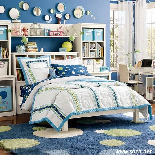 一样子的原理,只不过这间房间的主人好像更热爱学习,床头书柜上放满了书籍,旁边的书桌也看出主人所有的设计都是为了方便学习,看来这个小主人还真是个不折不扣的读书狂呢!蓝白的主色调看上去清爽极了,正值炎炎夏日,喜欢的还在等什么呢?