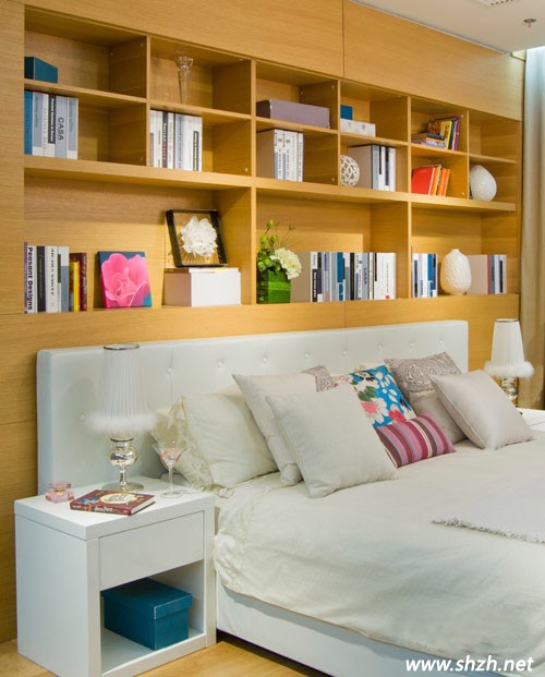 还想没大家称之为乱家女王吗?或许这并不是你的本意,可大大小小的小饰品、各式各样的装饰摆件以及经常要翻越的书籍在不知不觉间都让你的卧室变得惨不忍睹了,那么为何不干脆利用床头空间来做一个收纳型的书柜,让你的这些小物品都乖乖的呆在里面,这样卧室想不干净都难啦!