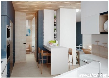 厨房空间并不可能都是中规中矩的形状,也许由于整体房型的特殊性,需要将厨房变的曲曲折折,也可能厨房和其他空间共处一室,那么此时就需要想想如何才能将不规则房型进行充分利用,怎样才能让设计的有效性达到最高级别。