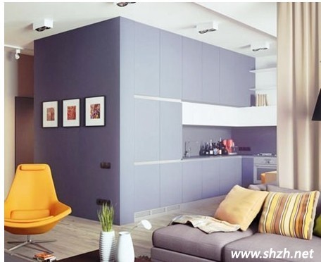 和客厅设计在一起的厨房空间,将沙发后方的空间全部利用起来。在客厅和厨房之间用简单的布帘当成隔断,煮饭烹饪时可以拉上放置油烟飘出,厨房空闲时拉开,能保证整个空间视野的开阔感。厨房和整个墙面连成一体,紫色和白色相间的搭配将整个厨房都变的优雅非常。