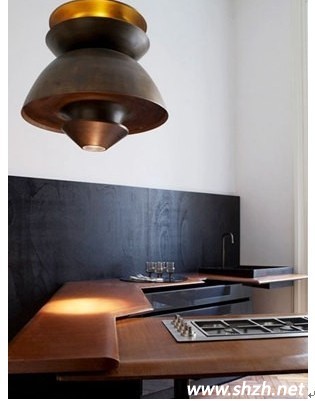 其实厨房空间还是比较规整的,但是主人却将整个橱柜和操作台面进行了不规则处理,层层叠叠的柜面增加了整个空间的层次感,打破了普通空间的中规中矩感。半墙黑色半墙白色的搭配也让整个厨房空间变的很经典,棕色的橱柜店主其间,也让整个厨房变的很典雅有气质。
