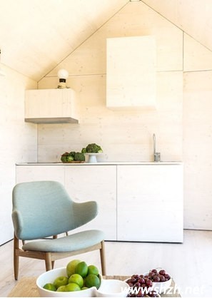 斜面厨房设计,很好的将尖锥形的空间给利用了起来。定制的橱柜呈现三角形,中间留出的操作区域也随着柜子的延伸而变大。进门之地能从墙面中延伸简易的桌面,从而设计成简易的吧台,正好能将三角形橱柜后方的大面积空间给利用起来。