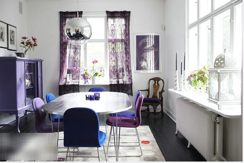 白色和黑色相搭配的餐厅具有时尚感,最好地表现出充满品质感的就餐空间。至于家具和配饰等,选择紫色会令人沉静平和,而深蓝色的加入也更显深邃意境。