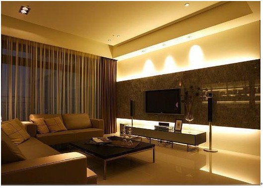 暖棕色客厅设计,搭配硬朗的棕色电视背景墙,让客厅空间沉稳大气。而射灯恰到好处的照射,建构出静谧的空间协调性。浅色的细线条花纹图案,给深色系的刚硬添入了柔和的元素,活泼了客厅的气氛,与整体客厅空间协调。