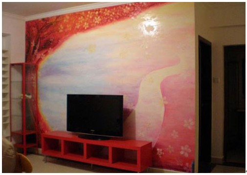 客厅泼墨图案的沙发随性而自然,电视墙挂画也采用随性自然的风格,红与白搭配出的电视背景墙面,让客厅空间赋予创意性和现代感。