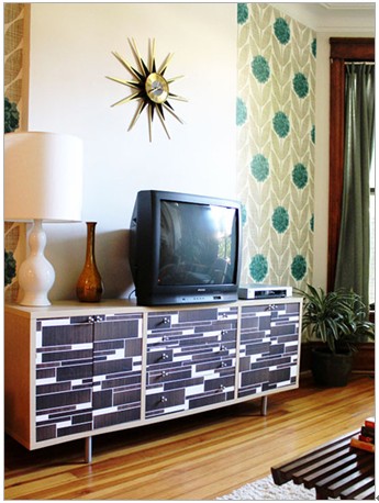 永不过时的拼接风设计,深受年轻人的喜爱。色块拼接的电视柜可呼应潮流的单品。背景墙绿色的球状图片搭配金属质感的太阳神钟,让整个空间有着古巴比伦的风味,绿色的点缀有着初春的气息。