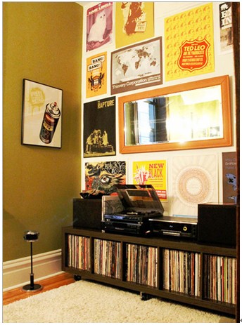 书房一角放满了CD,闲暇时刻可以听听音乐或自己高歌一曲。收纳方面CD全部放置在单层收纳柜中。柜上放置着播放器和音响,书房一角的音乐小天地。墙壁上大大小小不一致的装饰画,让这面墙壁从色彩到线条上都碰撞出一种**,为了很好的平衡这种视觉刺激,为了突出这面墙所来带的刺激,在另一面墙的设计上只采用了墨绿的素色。