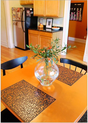 生机勃勃的花艺点缀居室一角,清新而鲜活,橙色的小花瓣也是特意选择的,与整个空间色调向和谐。橙色的小饭桌,也很好的表达了空间的主题色调。斑驳的小桌垫增添了色彩的层次感和立体感。冰箱上可爱的小装饰俏皮和生动。