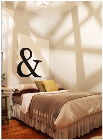 卧室很温馨的色调,咖啡色/香槟色/白色,三色搭配完美的构建出一个温馨舒适的空间,墙壁音符装饰图片,有种曲线的美感。鸟巢形线条的吊灯,夜晚使用可折射出斑驳的影像,洒满整个居室空间,体现出另一种层次线条所带来的美感。