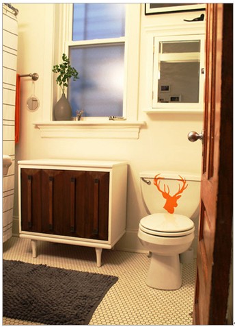 柔和的灯光可避免卫浴间的冷清感,橘红色的鹿头装饰在泛白的空间内增添些鲜活。卫浴间求整洁/明亮的同时,收纳也是很重要的一点,这里没有过多的装饰,一面镜子/两用的收纳柜,镜子背后是收纳柜哦,很实用又不占空间。