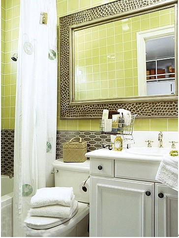 清新淡雅的淡绿色墙面砖给这个小小的卫浴间带来丝丝春意,金属质感的镜框装饰,点缀卫浴间不规则感。线条简单的白色浴室柜/马桶,都能很好的与绿色背景墙搭配,展示出另一种经典与清新。