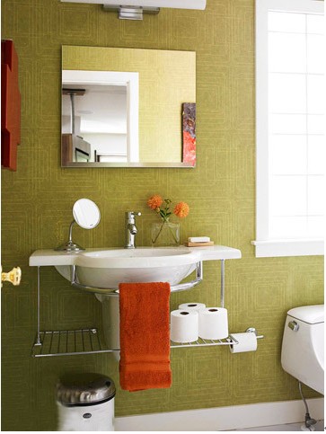 又是草绿色带来的清新感,台盆一侧的大窗户可带来新鲜空气,改一改卫浴间沉闷的潮湿环境,柔和的光线带给你一整天的新鲜,方方正正的浴室镜与绿色图案背景墙让卫浴间更加欢快。