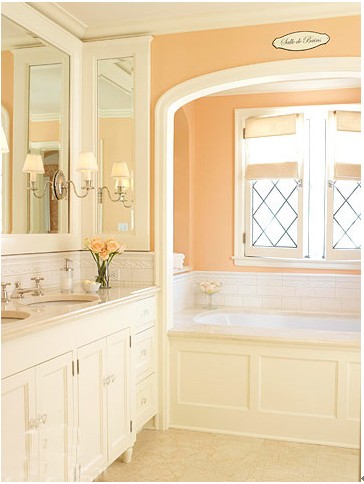 香橙色的墙面打造一个暖暖的卫浴间,**的墙面将整个卫浴间的气氛也渲染的淡淡的。米白色的浴室柜,米色地砖,精致的欧式壁灯,以及镜子里的幻影,都让整个空间展现出不一样的宫廷味道。