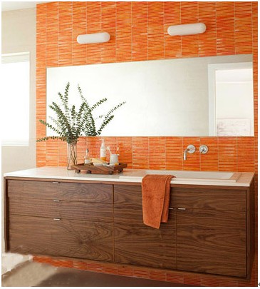 扎眼的橙红色背景墙让整面墙组成了一幅有趣的画,两只有趣的壁灯貌似壁画的眼睛,大大的镜子成了嘴巴,一眼望去像正咧着嘴开怀大笑的动画人物。深棕色的浴室柜刚好与橙红色背景墙形成很大的反差,沉稳中凸显出活泼。