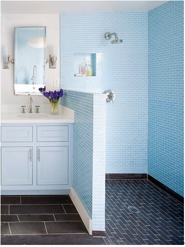 整个淋浴区全部选用了尺寸相同的蓝色墙砖铺设,蓝色打破了白色卫浴间的单调。墙面上凹进去的四方形可以做小小的储物空间,可放置些沐浴必须品。
