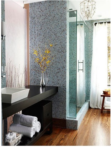 小色块的马赛墙面砖拼接整个淋浴区,淋浴区外墙内包裹着一层玻璃淋浴房,很独特的设计,玻璃门的将干湿区分开,完全不用担心水会溅到实木地板上。质感的黑色木质台面和浴室柜,搭配白色的方形台盆,将整个卫浴间的大气烘托出来。