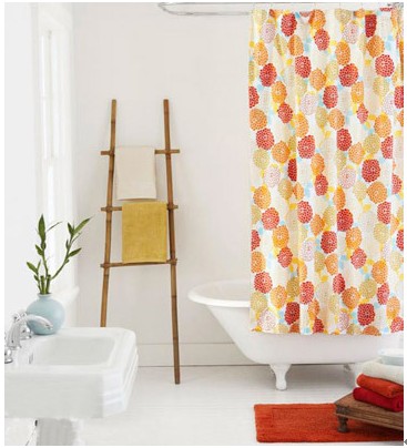 洁净的白色空间内装饰着印花的浴帘,将单调的空间变的充满童趣,地面上橘红色防滑小地毯/橘红色浴巾都是设计好的,将清新素雅的感觉发挥到极致,便是给人舒适洁净的感觉。