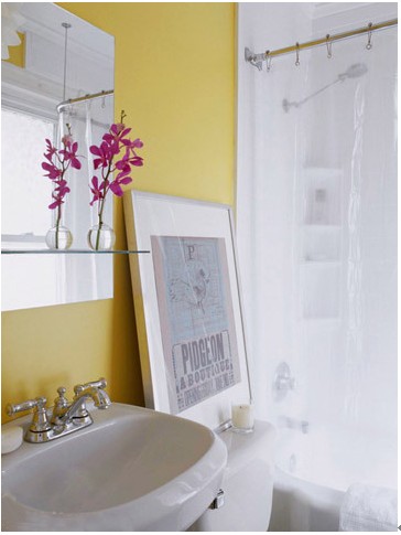 白色百搭的色彩,它能与任何色彩和谐搭配,在这个狭小的空间内,白与黄的搭配让空间显得通透明亮,一抹紫色的小花像跳动的小精灵,将带给你不一样的心情。如薄纱般的浴帘将卫、浴隔开,使得沐浴环境如梦如幻,朦胧中放松你的身心。