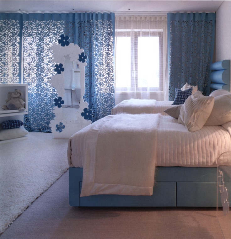 为了突出空间的清雅的氛围,在这个项目中有意将窗帘的装饰元素设计成镂空的花纹图案,在美化窗帘的同时又增加了空间的通透性。再配上一层薄薄轻纱帘,朦胧中显示出高雅的气质。在色彩上采用淡蓝色调,能够在火热的夏季里为人们带来丝丝清爽的感受。