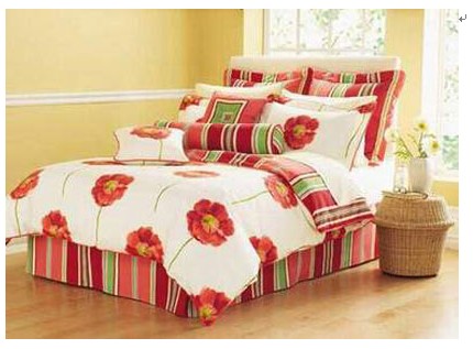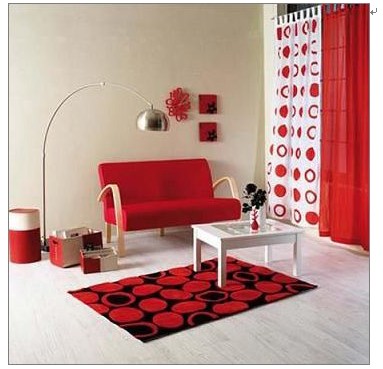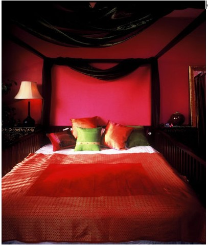 居室色彩搭配应考虑突出主色来进行装饰,而不是考虑到某个突出的东西。围绕主题色来进行色彩搭配,这样搭配起来更精致,比较有韵味,更耐看。例如:鲜明的红色背景墙面使人精神振奋,而红色床品与背景墙面色彩呼应,黑色的幔帘和床架都与红色完美搭配。所有的居家布艺色彩一定要和背景色主色基调相配。