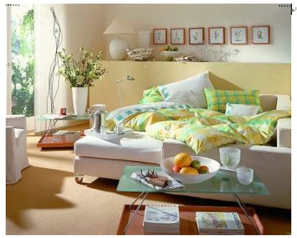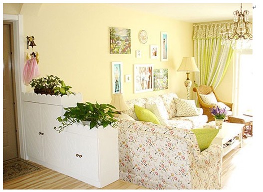 绿意浓浓的居室色彩搭配,绿与白的窗帘、靠枕色彩一致,大面积乳白色、暖黄色背景墙与沙发、布艺,共同营造了一个温馨而暖意洋洋的居室空间。