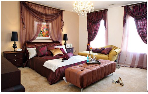 紫红的色彩,精美的床头装饰与窗帘,配上精致的台灯,使人一入卧室,便陶醉于浪漫的爱情氛围之中。