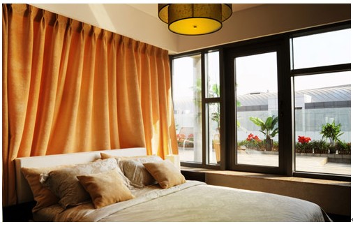卧室床头搭配了大面积橘红色装饰帘,打造出很好温馨效果,而窗外绿色的植物让盎然生机跃然眼前,使人在一觉醒来便可以感受到大自然的气息,暖洋洋的阳光洒满整个居室,带来一整天的好心情从这里开始。