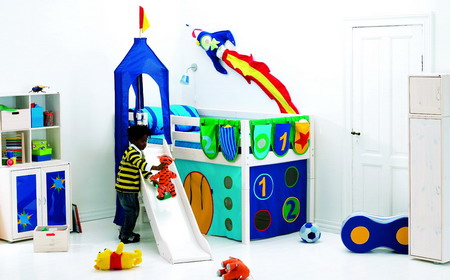 儿童专家表示,最好能给孩子一个游戏空间,因此最好选择有趣味的家具,比如有滑梯、帐篷的,而且儿童房家具的摆设最好紧凑些,以便能腾出更大的游戏空间。