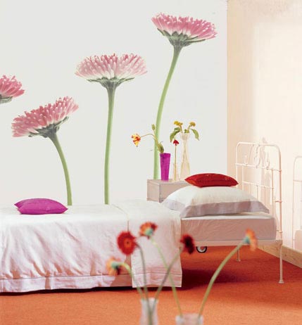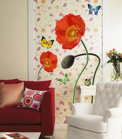 花朵在客厅墙上的绽放,乘风飘舞的样子似乎让人感受到了从窗外吹来的徐徐清风。橙色的花朵与客厅中橙色的沙发相呼应,房间布置浑然一体。墙贴就这么巧妙地把房间装扮得和谐统一而又富有创意。