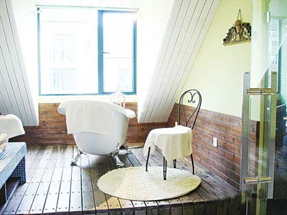 阁楼卫浴间如果直接摆放浴缸,沐浴的时候看到头顶的斜坡会有种压抑感。垫高后的浴缸正好正对着窗口,当主人在享受洗浴带来的舒适感的同时,还可以顺便看看外面的风景。而相比较瓷砖和马赛克,桑拿木的脚感更温暖、更舒适,为整个卫浴间增加了装饰效果
