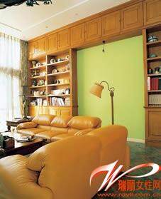 2 占据整面墙的落地柜是实木质地的,自然的木色、黄色的沙发与淡雅的青草绿色搭配在一起,显得非常谐调,在落地柜的中间预留了挂画的位置,这里将成为以后客厅的视觉中心。