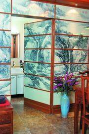 推开玻璃门,里面真是别有洞天。一整面墙被一幅巨大的泼墨山水画所覆盖,说得确切点,这一面墙就是一幅画。“我喜欢中国的字画,不一定非是什么名家名作,闲暇时候看看,眼睛都觉得舒服。”张先生平时工作压力很大,借助这些淡雅脱俗的字画可以舒缓白天紧张的神经,“这是我的一个亲戚画的,完全按照我家墙的尺寸,然后由师傅精心地一小幅一小幅地裁下来,做好实木框架,嵌入画,再镶上水晶玻璃,然后再一幅幅地钉到墙上去。”