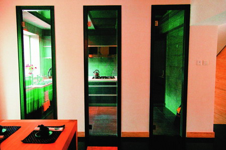 居室的主人是一对年轻夫妇,在家自己下厨做饭是他们业余生活中的一大乐趣,这里也成为他们经常交流的地方,周末偶尔也会在家搞个小家宴。这个户型的厨房与餐厅仅一墙之隔,主人把这道墙打掉,改成了墙与玻璃相间的门,使厨房成为了半开放式,达到延展空间的效果,形成了一个温馨而实用的用餐氛围。