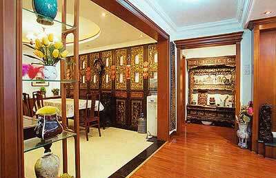 如果独立柱柜距离壁不远,可采用以木板或矮柜把穹与墙壁连成一体。柱壁板可以挂画或花草来作装饰,而矮柜则可令视野通透,增加景深,没有沉闷闭塞之感。