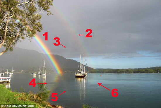 不过,对于其他人来说,在照片中发现每道彩虹可能需要费点功夫。诺拉是在可以俯瞰卡姆登黑文河的家中拍到这张令人惊叹的照片的。卡姆登黑文河位于悉尼以北321公里。虽然一些人士可能称,他们最多能在照片中看到三道或四道彩虹,但诺拉称,她能够在照片中看到六道彩虹。诺拉说,她最初认为自己拍到了四道彩虹,将照片送给了英国大气光学专家莱斯-考利博士,考利博士称,他在照片中还能看到两道彩虹。考利博士称:“多年以来,人们报告称发现了许多奇怪的和难以解释的彩虹,但是由于没有照片,专家们很难知道人们究竟看到了什么。诺拉的六道彩虹照是非常罕见的。